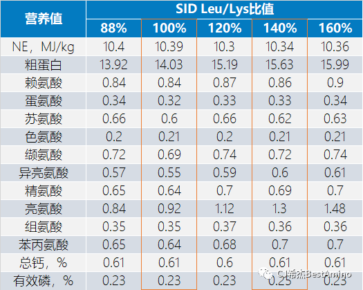 3.日糧亮氨酸過(guò)高(SID Leu/Lys比值140%)時(shí),需要注意平衡異亮氨酸、纈氨酸、色氨酸和賴(lài)氨酸水平。