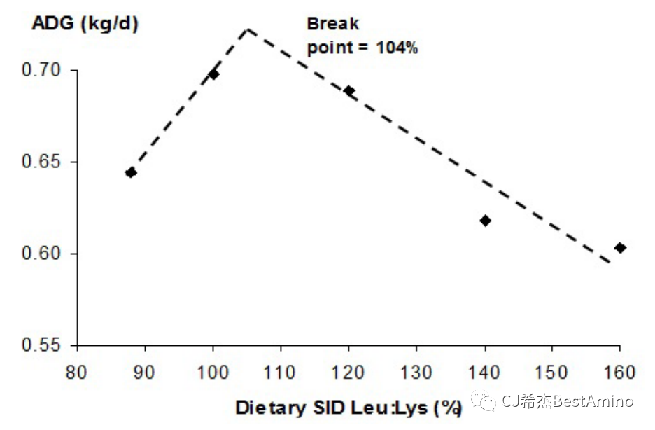 1.日糧亮氨酸與賴(lài)氨酸比值生長(zhǎng)豬生長(zhǎng)性能(ADG和FCR),以ADG和FCR為指標(biāo),最佳日糧SID Leu/Lys比值分別為104%和109%。