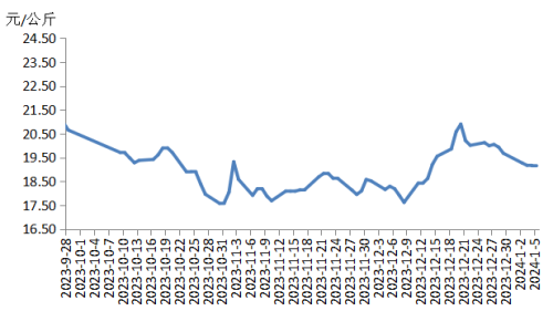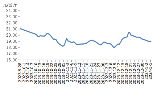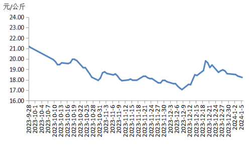 本周華中地區(qū)豬肉價格環(huán)比下跌。周內(nèi)散養(yǎng)戶和規(guī)模養(yǎng)殖場出欄充裕,加之現(xiàn)階段宰后均重處于偏高水平,豬肉供應(yīng)充足。元旦過后,終端市場采購豬肉的意向減弱,加之腌臘活動基本收尾,豬肉需求減少,價格持續(xù)下跌。