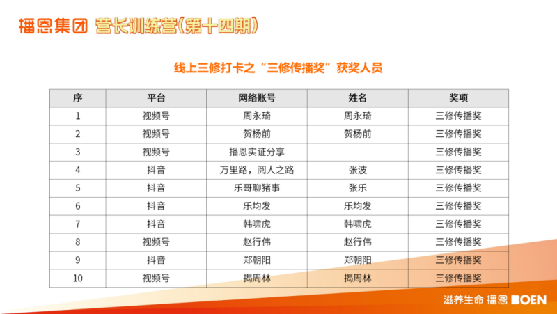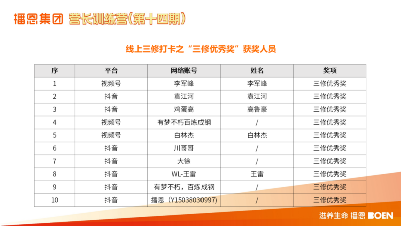 在閉營(yíng)儀式上,播恩集團(tuán)還對(duì)表現(xiàn)突出的營(yíng)長(zhǎng)們進(jìn)行了表彰,頒發(fā)了榮譽(yù)證書(shū)和獎(jiǎng)品,以彰顯他們?cè)谟?xùn)練營(yíng)期間的卓越表現(xiàn)。這些營(yíng)長(zhǎng)們不僅在課程學(xué)習(xí)中展現(xiàn)出卓越的能力,更在三修實(shí)踐活動(dòng)中充分展現(xiàn)了協(xié)作精神和創(chuàng)新能力。