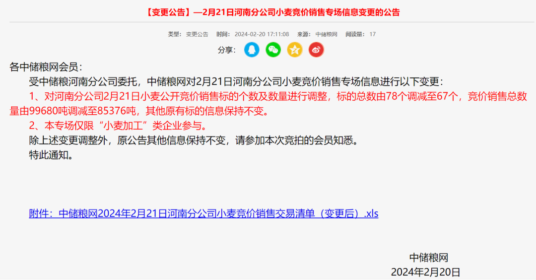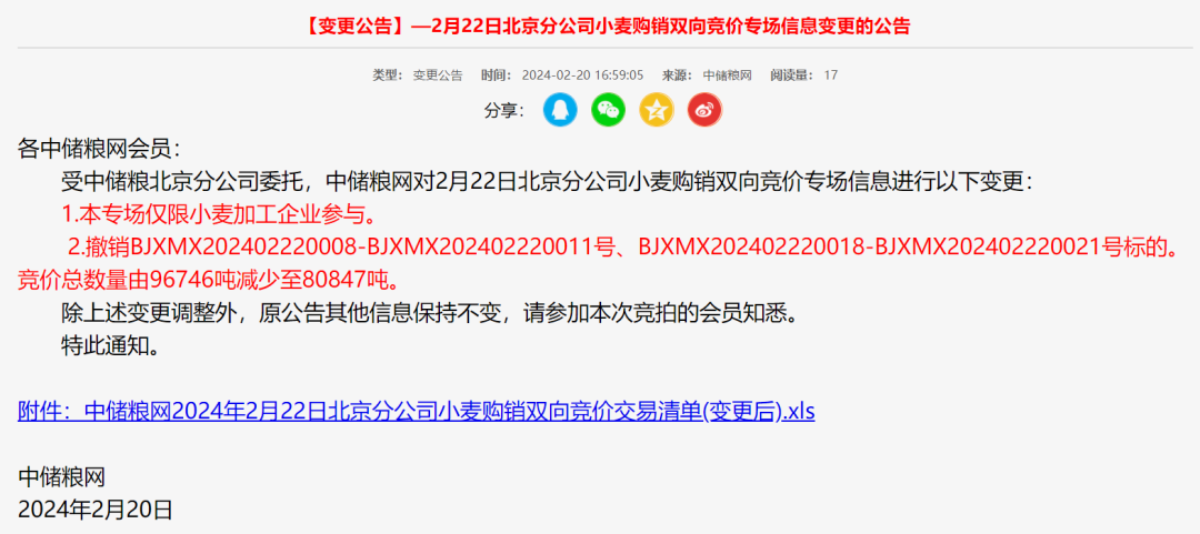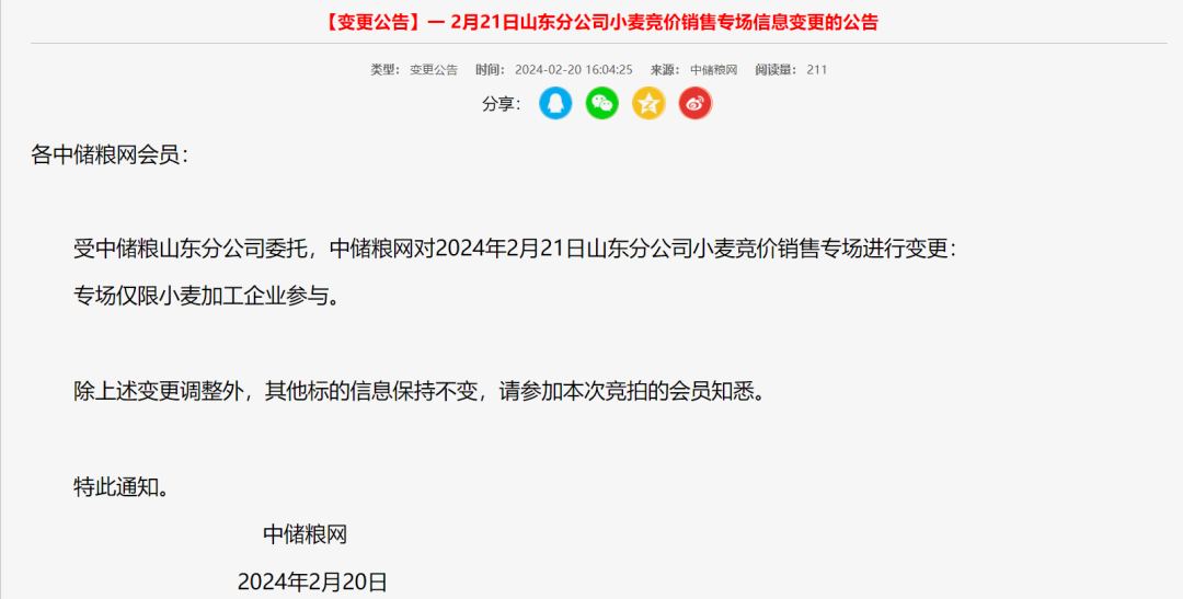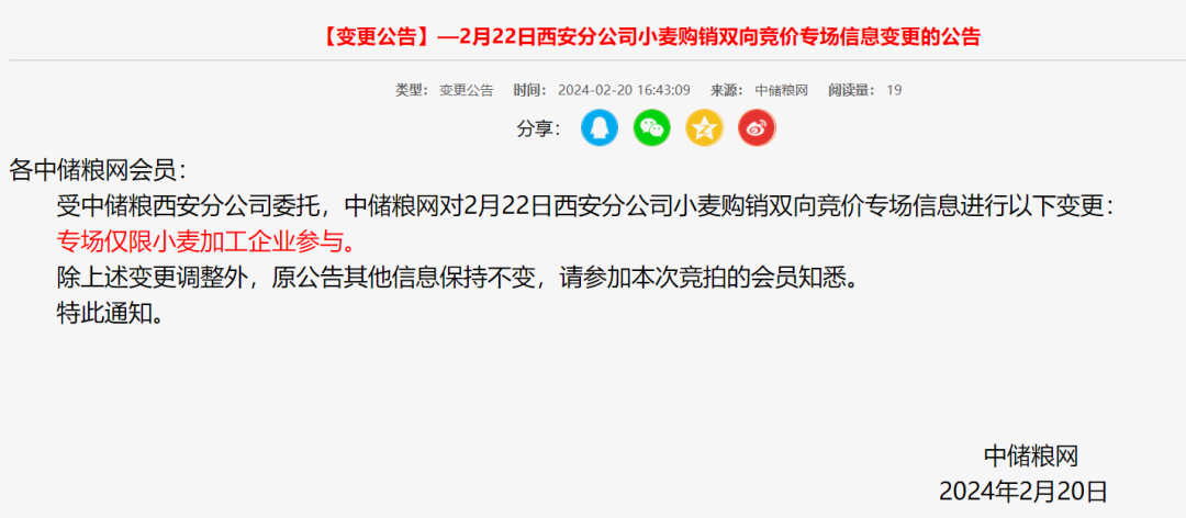 2月20日,中儲糧網(wǎng)發(fā)布最新消息,中儲糧河南分公司2月21日小麥銷售專場、山東分公司2月21日小麥銷售專場、2月22日西安分公司購銷雙向?qū)觥?月22日北京分公司購銷雙向?qū)觥?月22日湖北分公司購銷雙向?qū)龆缄懤m(xù)進行變更:僅限小麥加工企業(yè)參與。