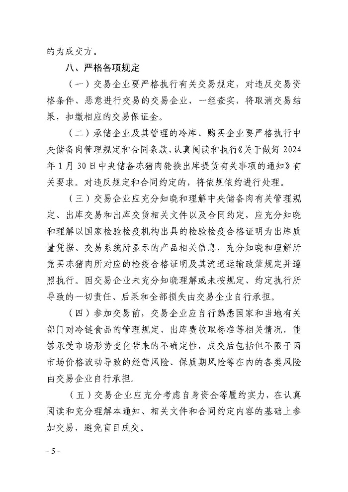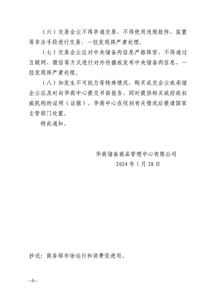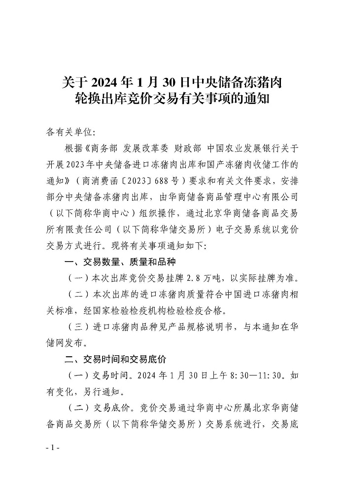 華儲(chǔ)網(wǎng)2月27日發(fā)布關(guān)于2024年2月28日和29日中央儲(chǔ)備凍豬肉輪換出庫競(jìng)價(jià)交易有關(guān)事項(xiàng)的通知。本次出庫競(jìng)價(jià)交易掛牌0.91萬噸,以實(shí)際掛牌為準(zhǔn)。交易時(shí)間為2024年2月28日上午8:30-11:30。如果2024年2月28日上午有未成交的標(biāo)的,則在2月29日上午對(duì)未成交的標(biāo)的重新掛牌出庫交易。
