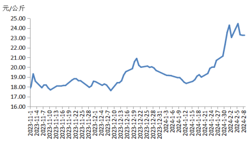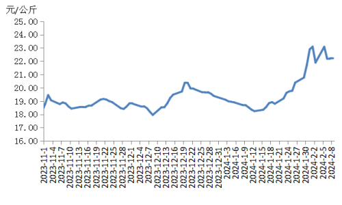 本周華東地區(qū)豬肉價格環(huán)比上漲,周內(nèi)先漲后跌。周初恰逢春節(jié)備貨的高峰期,豬肉訂單量明顯增多,銷售速度加快,帶動價格上漲;隨著春節(jié)備貨進入尾聲,豬肉價格小幅下跌;周末時,散養(yǎng)戶和規(guī)模養(yǎng)殖場出欄生豬的數(shù)量減少,同時豬肉訂單量亦減少,供需雙減,市場成交活躍度降低,價格波動幅度不大。