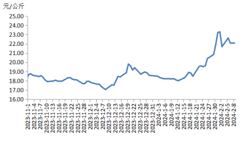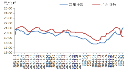 本周,四川豬肉周均價為每公斤20.30元,環(huán)比上漲2.1%,同比上漲12.2%,漲幅較上周擴大4.7%。周前期,受北方地區(qū)豬肉價格下跌行情影響,本地區(qū)散養(yǎng)戶出欄積極性轉(zhuǎn)強,加之部分地區(qū)的生豬及豬肉外調(diào)量減少,本地區(qū)供應充足,豬肉短時小幅下跌;周后期,隨春節(jié)臨近,終端市場備貨需求明顯增多,而部分經(jīng)銷商停工休假,造成短時供小于求,價格明顯上漲。
