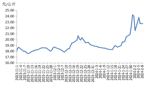 據(jù)農(nóng)業(yè)農(nóng)村部信息中心和山東卓創(chuàng)資訊股份有限公司聯(lián)合監(jiān)測,2024年第6周(即2024年2月5日-2月8日,以下簡稱本周),16?。ㄖ陛犑校┦萑庑桶讞l豬肉出廠價格總指數(shù)的周平均值為每公斤22.43元,環(huán)比上漲1.6%,同比上漲26.2%,漲幅較上周擴大3.9個百分點。