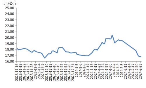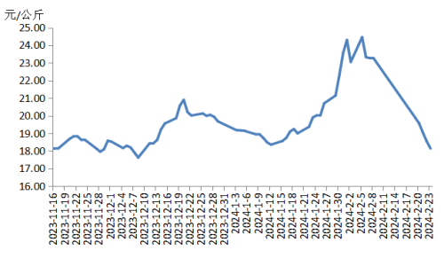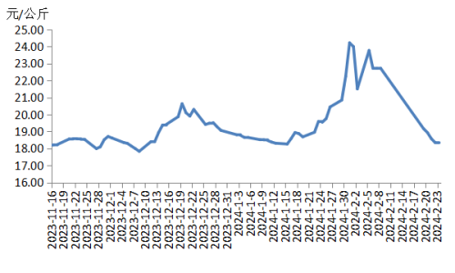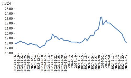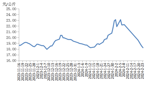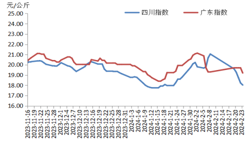 本周,四川豬肉周均價(jià)為每公斤18.78元,較節(jié)前下跌7.5%,同比下跌1.9%,同比由上周上漲12.2%轉(zhuǎn)為下跌1.9%。川內(nèi)散養(yǎng)戶(hù)出欄生豬的積極性較高,受天氣、價(jià)差等因素影響,外調(diào)生豬及豬肉訂單量減少,于是川內(nèi)豬肉供應(yīng)增多。當(dāng)前川內(nèi)居民仍以消化家庭存貨為主,批發(fā)市場(chǎng)交易清淡,經(jīng)銷(xiāo)商采購(gòu)較為謹(jǐn)慎。總體看供大于求,豬肉均價(jià)明顯下跌。