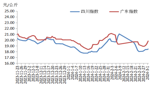 本周,廣東豬肉周均價為每公斤19.23元,環(huán)比下跌1.9%,同比下跌10.4%,跌幅擴大2.2個百分點。周前期,廣東地區(qū)豬肉供應(yīng)充裕,需求緩慢恢復(fù),經(jīng)銷商降價促銷;周后期,受南方地區(qū)豬肉價格上漲情緒提振,廣東地區(qū)挺價情緒漸起,豬肉價格上漲,但漲幅有限。總體看,廣東地區(qū)豬肉周均價環(huán)比小幅下跌。