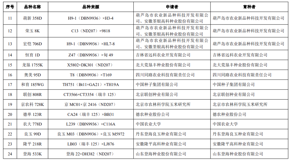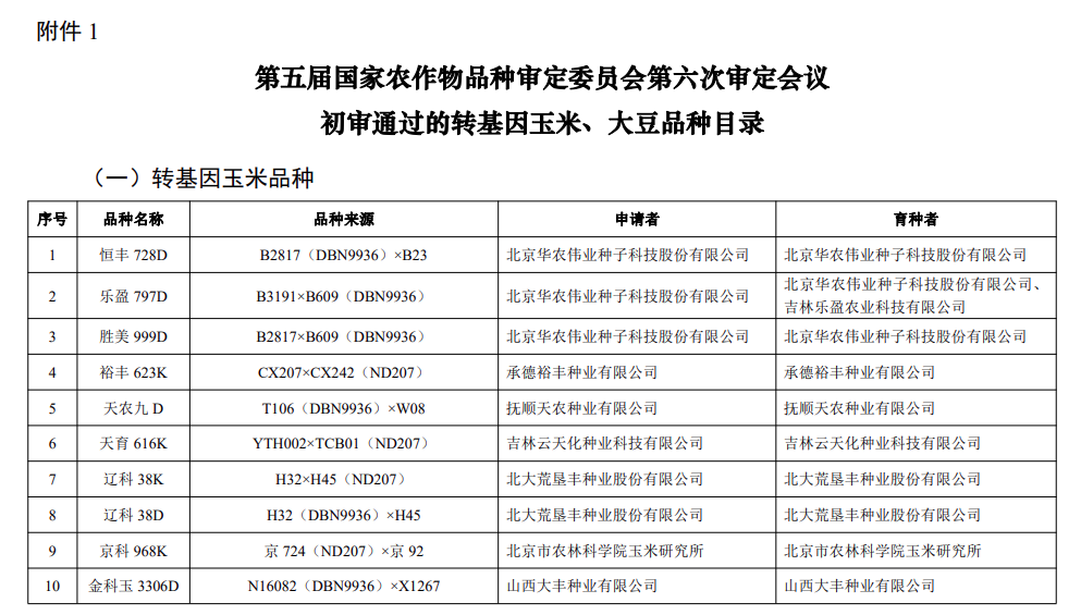3月19日,農(nóng)業(yè)農(nóng)村部官網(wǎng)發(fā)布關(guān)于第五屆國(guó)家農(nóng)作物品種審定委員會(huì)第六次審定會(huì)議初審?fù)ㄟ^(guò)品種的公示。其中,27個(gè)轉(zhuǎn)基因玉米和3個(gè)轉(zhuǎn)基因大豆品種通過(guò)初審,涉及大北農(nóng)、隆平高科、登海種業(yè)、豐樂(lè)種業(yè)等多家上市公司,其中有16個(gè)轉(zhuǎn)基因品種的轉(zhuǎn)化體所有者為大北農(nóng)。