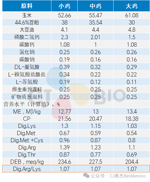 【試驗(yàn)設(shè)計(jì)】選擇540只ROSS雄性肉仔雞,平均分為2個(gè)部分,飼養(yǎng)于2個(gè)溫度的畜舍。對于每個(gè)畜舍,270只肉仔雞隨機(jī)分為3個(gè)處理組,每個(gè)處理組6個(gè)重復(fù),每個(gè)重復(fù)15只雞。肉仔雞分小雞(0-10d)、中雞(11-24d)和大雞(25-35d)3階段飼養(yǎng),配制3階段基礎(chǔ)日糧,小雞、中雞和大雞階段基礎(chǔ)日糧賴氨酸水平分別為1.3%、1.15%和1.03%,3階段精賴比均為1.07。在每個(gè)階段的基礎(chǔ)日糧中分別添加0.86kg/噸和1.72kg/噸精氨酸,分別配制出0.86ARG組和1.72ARG組日糧,兩組日糧可消化精氨酸與賴氨酸比值分別在1.13-1.15和1.2-1.23。3個(gè)階段基礎(chǔ)日糧為玉米-豆粕型日糧,日糧組成和營養(yǎng)水平如下圖所示: