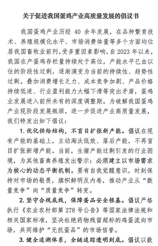 2025年10月11日,中國(guó)畜牧業(yè)協(xié)會(huì)組織召開(kāi)“蛋雞產(chǎn)業(yè)高質(zhì)量發(fā)展座談會(huì)”,我國(guó)20多家重點(diǎn)蛋種雞、商品蛋雞、品牌蛋、蛋品加工等領(lǐng)域的企業(yè)主要負(fù)責(zé)人到會(huì)交流。會(huì)議期間,形成《關(guān)于促進(jìn)我國(guó)蛋雞產(chǎn)業(yè)高質(zhì)量發(fā)展的倡議書(shū)》倡議書(shū)得到了國(guó)家蛋雞產(chǎn)業(yè)技術(shù)體系、15家省級(jí)行業(yè)協(xié)會(huì)以及37家蛋雞養(yǎng)殖企業(yè)的聯(lián)合發(fā)起。