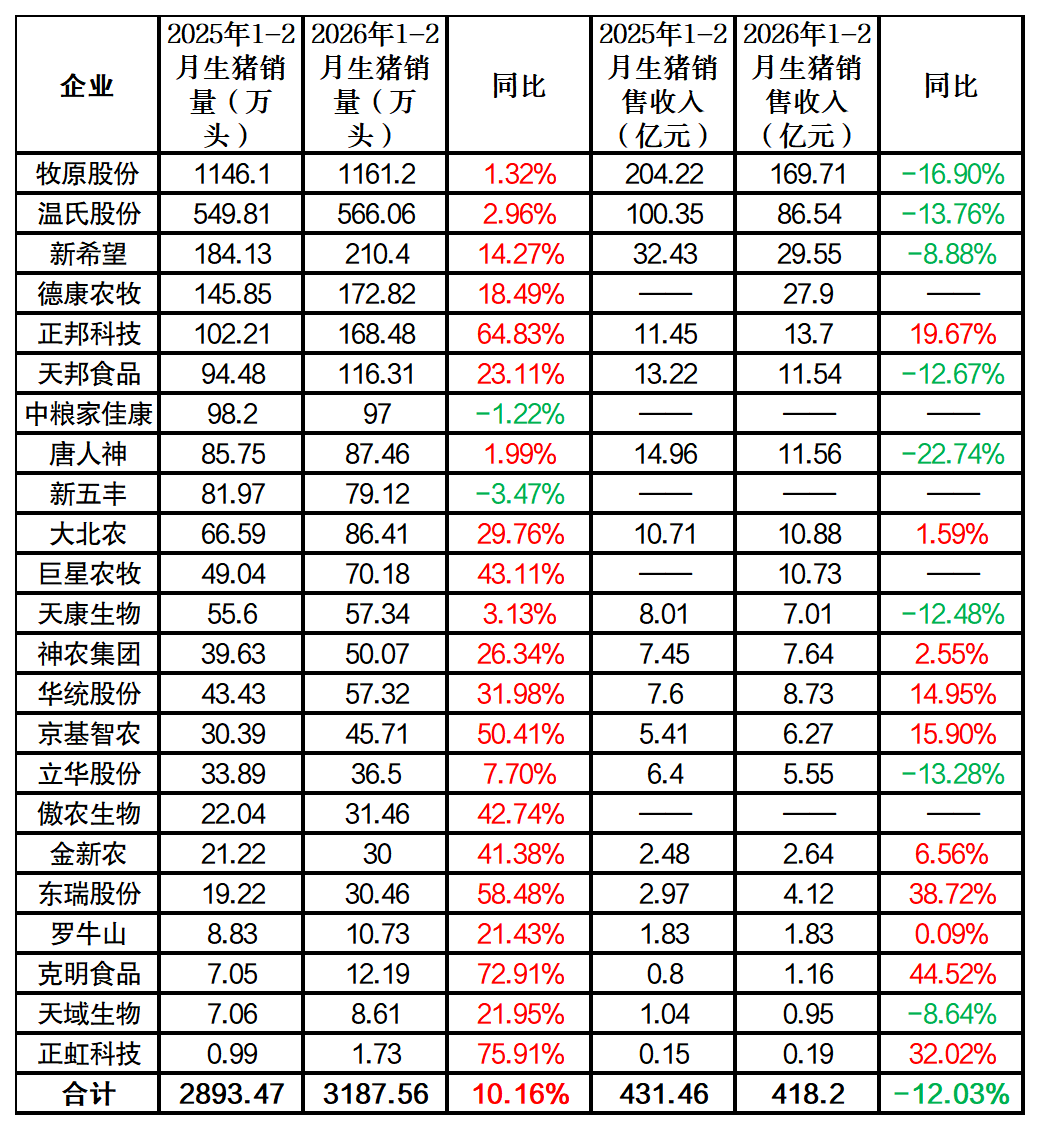 【BOYAR觀察】23家上市豬企1-2月生豬出欄量同比增長,銷售收入同比下滑