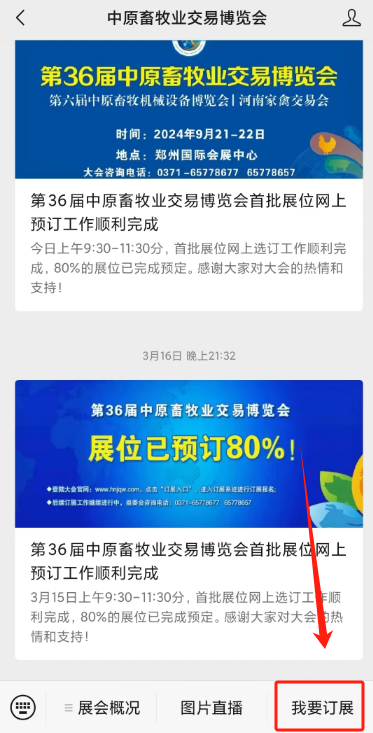 第36屆中原畜牧業(yè)交易博覽會(huì)(河南家禽交易會(huì))將于2024年09月21-22日在鄭州國(guó)際會(huì)展中心隆重舉辦,組委會(huì)各項(xiàng)工作已全面開(kāi)展,展位預(yù)定持續(xù)進(jìn)行中,可至大會(huì)官網(wǎng)www.hnjqw.com (訂展入口)或大會(huì)微信公眾號(hào)點(diǎn)擊“我要訂展”,也可微信搜索“中原畜牧業(yè)交易博覽會(huì)訂展系統(tǒng)”進(jìn)入小程序預(yù)訂展位,小程序與網(wǎng)站版訂展系統(tǒng)數(shù)據(jù)完全同步,如已有賬號(hào)可直接登錄,無(wú)需重新注冊(cè)。